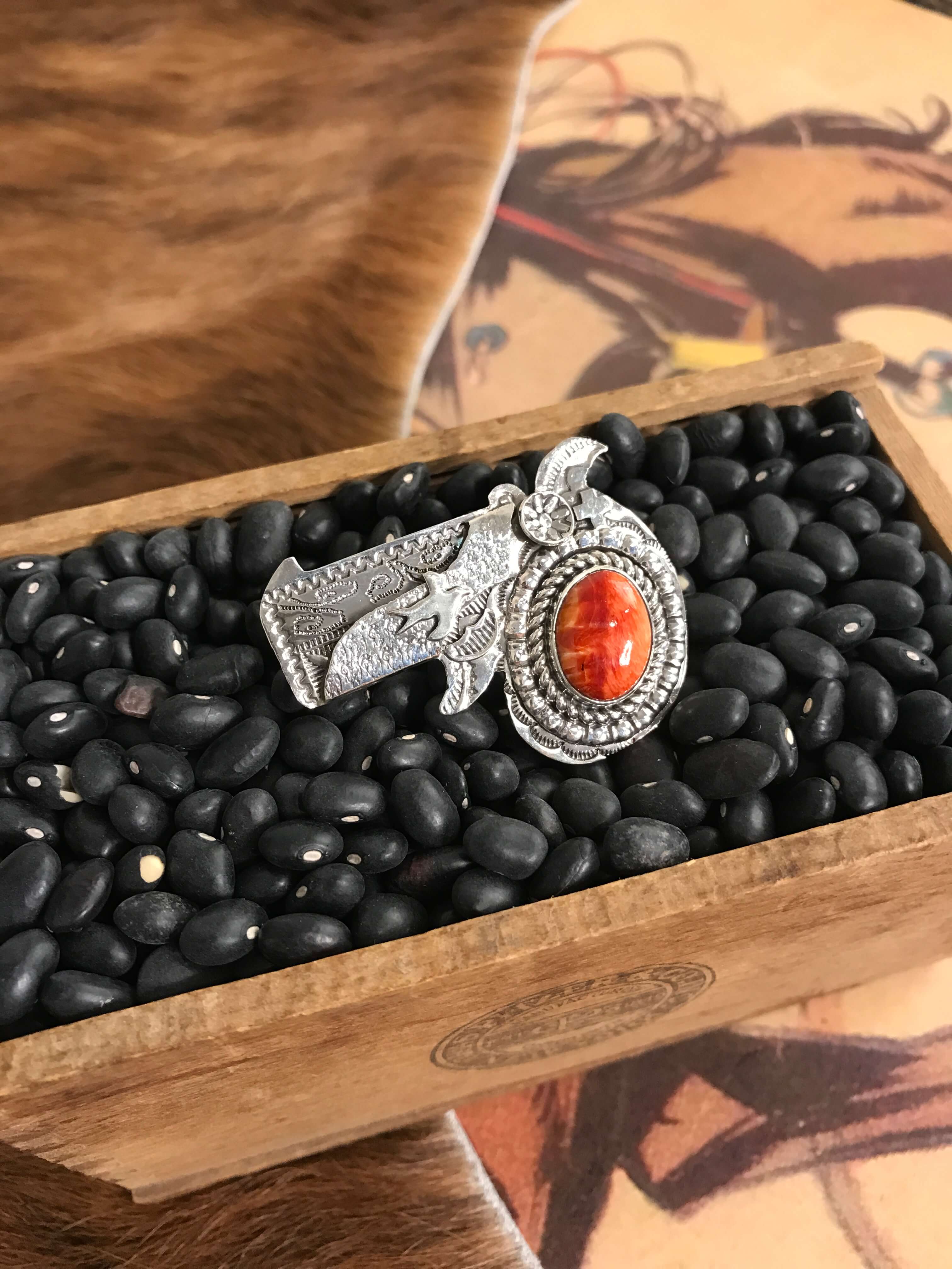 Do not get your jewelry wet.Water, hand sanitizer, and any type of liquid product can cause stones to loosen. Always remove rings before washing your hands or using hand sanitizer or lotions. Most Native American artists and silversmiths in general use a natural fiber such as sawdust or cork shavings to set their stones and when wet this can expand and cause damage to the piece. Avoid exposing your jewelry to heat or chemicals like ammonia or chlorine, most household cleaning products, and products like lotions and oils.